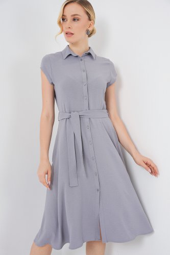 1677 Boydan Düğmeli Kuşaklı Elbise Gri