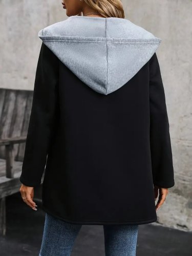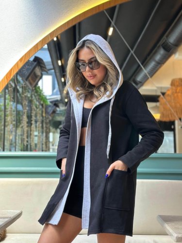 Kadın uzun kollu kapşonlu çift renkli şardonlu iki iplik ceket