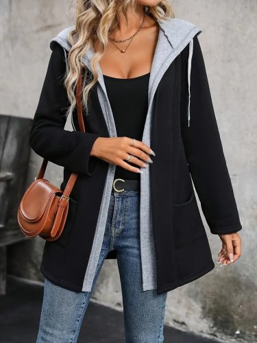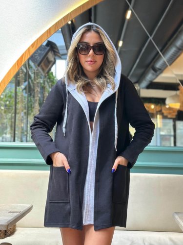 • Kadın uzun kollu kapşonlu çift renkli şardonlu iki iplik ceket