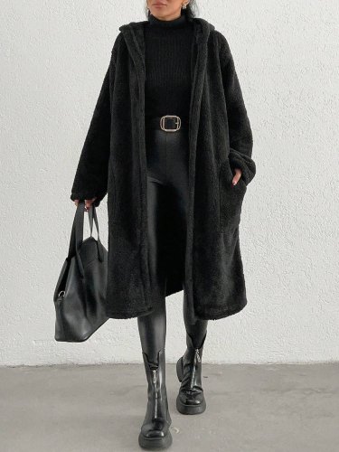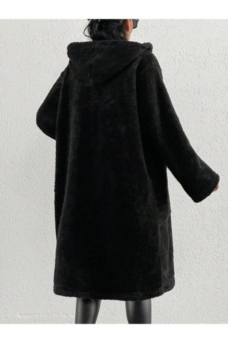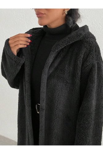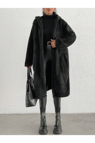 Kadın kapüşon ve cep detay uzun astarsız wellsoft ceket